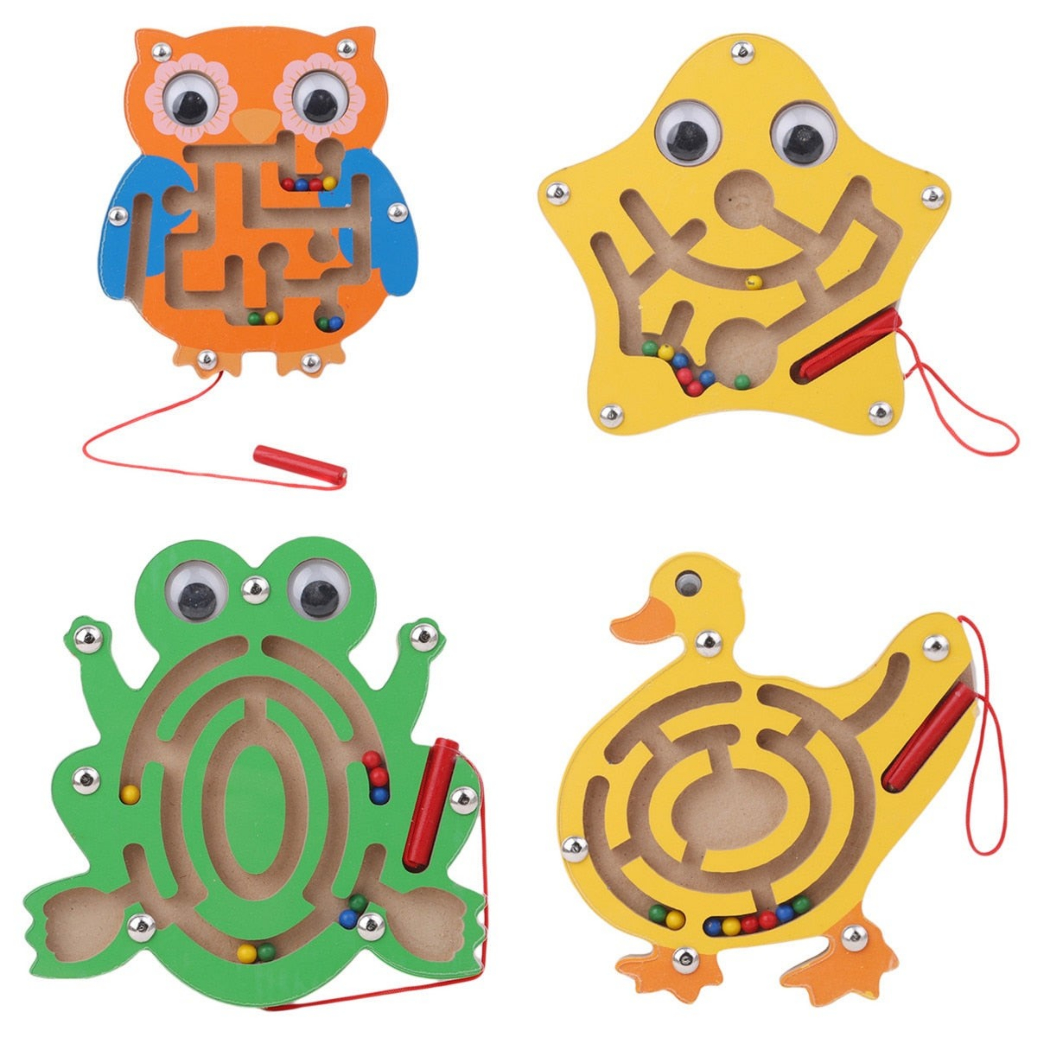 Magnetické bludiště ve tvaru různých zvířátek. Pomocí magnetického nástroje se přesouvají kuličky uzavřené pod průhledným krytem.