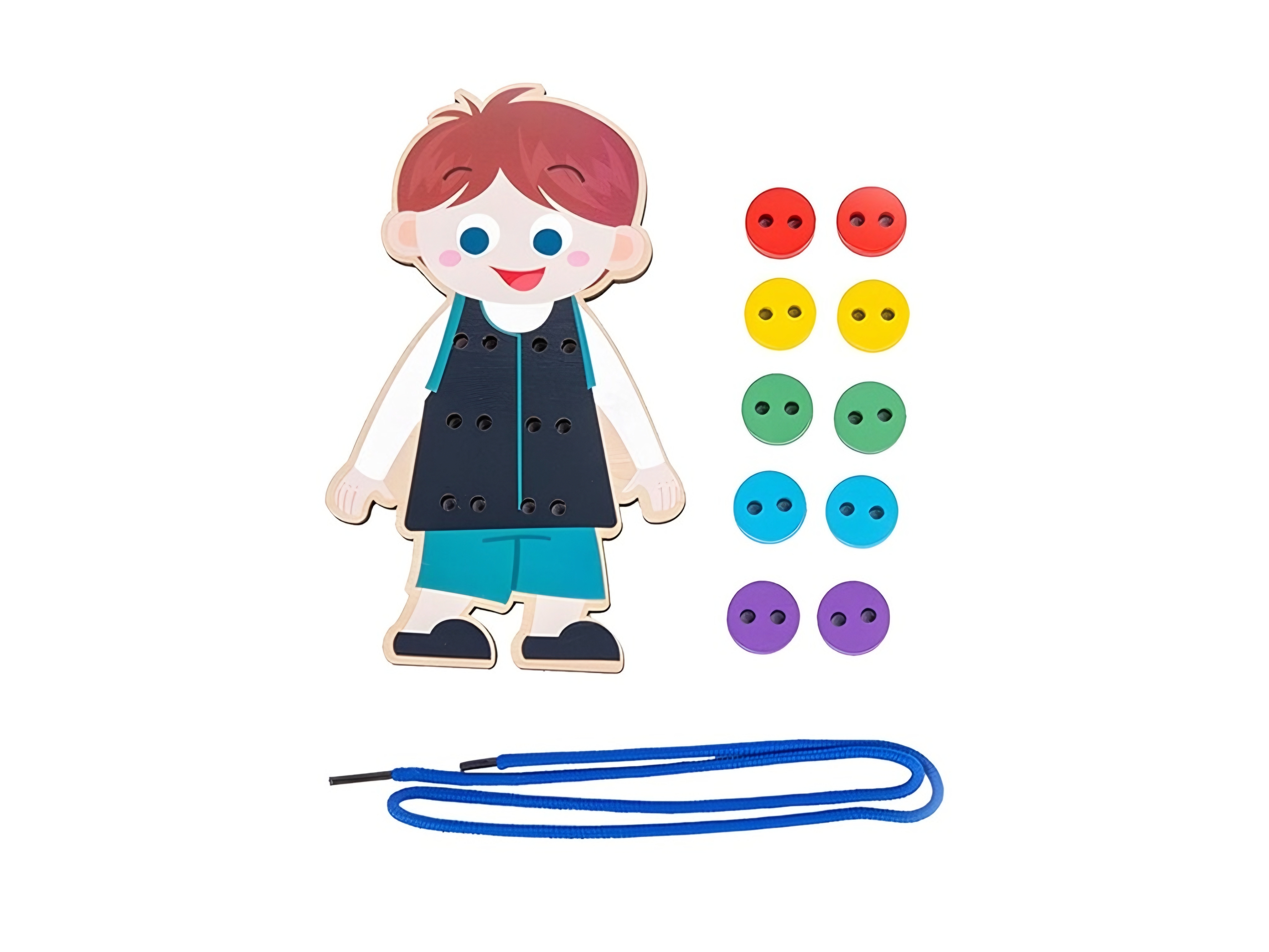 Dřevěný navlékáci panáček /kluk s knoflíky . Ideální pro rozvoj jemné motoriky, koordinace rukou a očí. Poznávání barev.